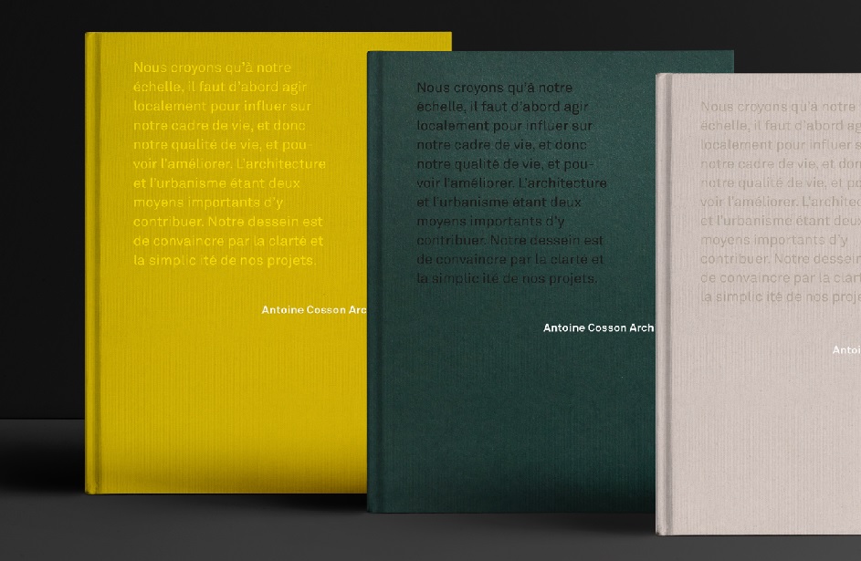 Alina Rybacka-Gruszczyńska to mieszkająca w Warszawie graficzka i architekt młodego pokolenia. Jej najnowsze dzieło to portfolio drukowane dla francuskiego studio architektonicznego Antoine Cosson Architecture. Projekt, podobnie jak działalność klienta, miał być zarazem innowacyjny, jak również tradycyjny. Dzięki wyborowi klasycznej formy, tj. książki w twardej oprawie, prostych fontów oraz kolorów nawiązujących do natury – z pewnością udało się zrealizować to zadanie. Warte uwagi jest charakteryzujące się jasnym, pełnym oddechu wnętrze portfolio, w którym zdjęcia i rysunki idealnie współgrają z tekstem.