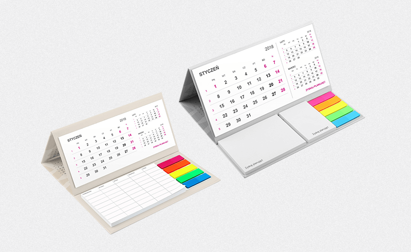 Robi wrażenie, prawda? W tym roku wprowadziliśmy do oferty stojący kalendarzo-notes, czy też kalendarz z notesem, który nazywamy „hybrydą”. Rozwiązanie to pozwala na realne zaoszczędzenie miejsca na biurku, łącząc w sobie kalendarz biurkowy, notes (np. w formie planera) lub notesy oraz samoprzylepne kolorowe znaczniki. Twoi pracownicy z pewnością docenią taki prezent i zachwycą się funkcjonalnością, pomysłowością oraz jakością wykonania naszego innowacyjnego kalendarza biurkowego z notesem na 2018 rok.