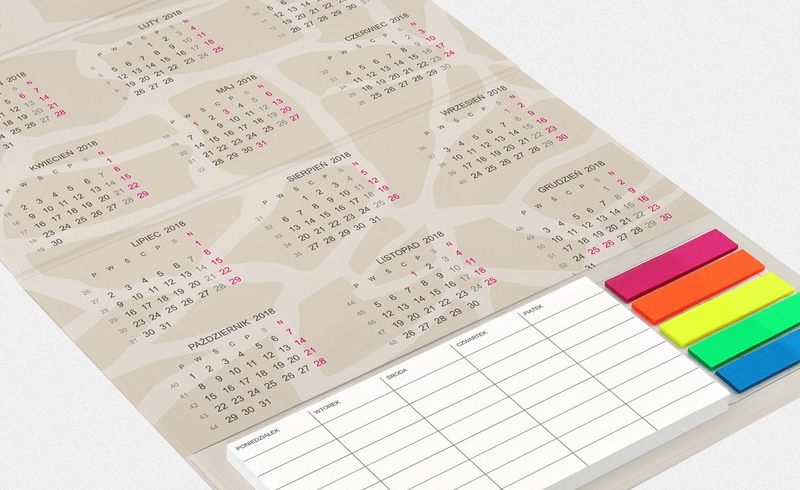 Czym jeszcze wyróżnia się nasz kalendarz biurkowy z notesem i karteczkami na 2018 rok? Poza podstawowymi elementami (notesem, samoprzylepnymi znacznikami i dużym kalendarium bieżącego miesiąca oraz mniejszymi poprzednim i następnym) w jego wewnętrznej części nadrukowane może być np. całoroczne kalendarium oraz zestawienie dni wolnych od pracy.