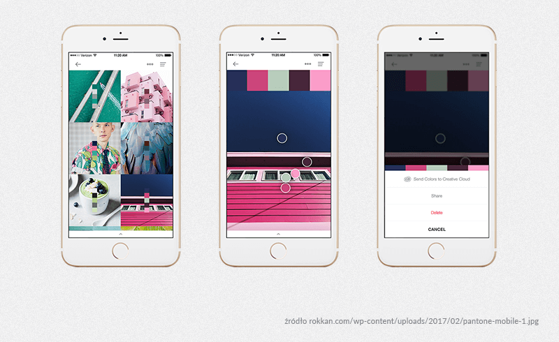 Wystarczy na telefon ściągnąć aplikację Pantone Studio (dostępna jedynie na iPhone,). Ta przemyślna apka odnajdzie wskazany na fotografii kolor w palecie Pantone oraz udostępni jego opis w przestrzeni barwnej CMYK, RGB oraz Hex. Co ciekawe, możesz zrobić zdjęcie na żywo lub wgrać do programu dowolną fotografię z pamięci smartfonu. Dodatkową funkcją Pantone Studio jest wskazanie barw, które będą dobrze wyglądać z wybranym przez nas kolorem. Ważne dla grafików jest z pewnością to, że aplikacja współdziała z oprogramowaniem Adobe i można np. wysłać wybrane przez siebie kolory bezpośrednio do biblioteki kolorów w Photoshopie.