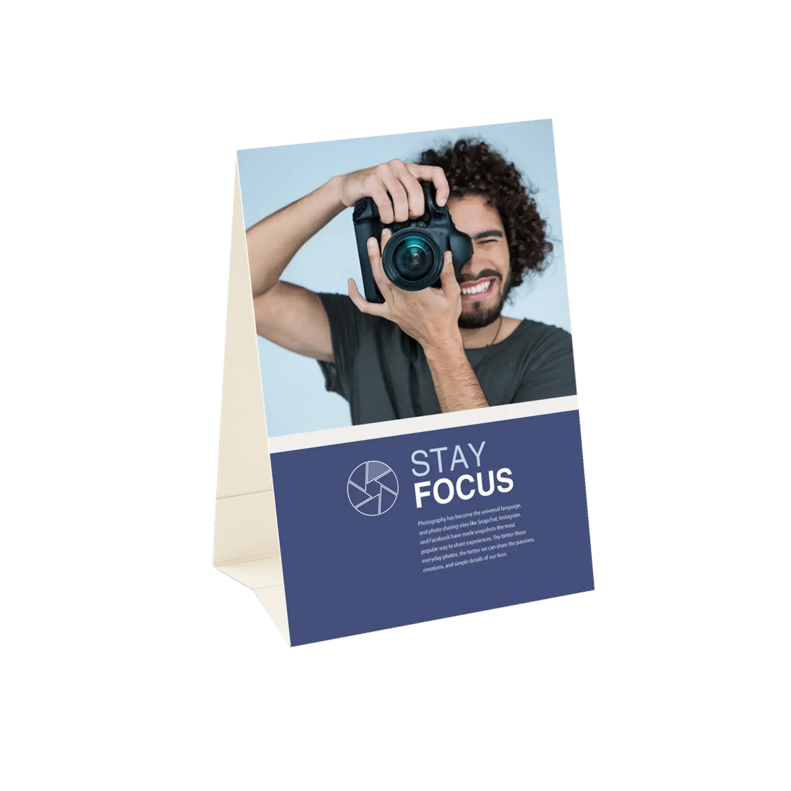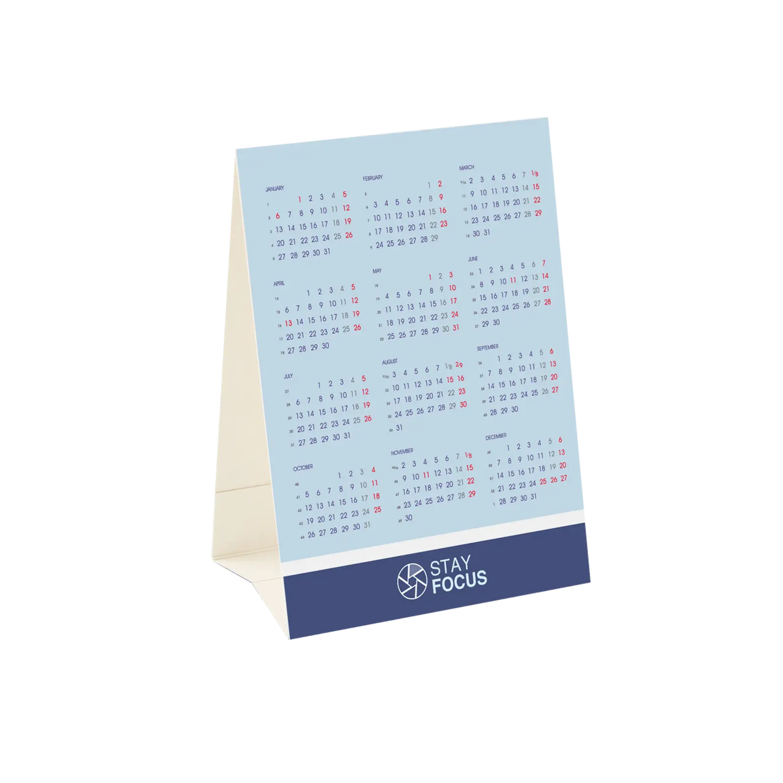 Standing pyramid calendar is the smallest and cheapest among desk calendars. Despite its small size, there is quite a lot of space here for printing an individual project. It can include business information, company advertising or any other graphic design.