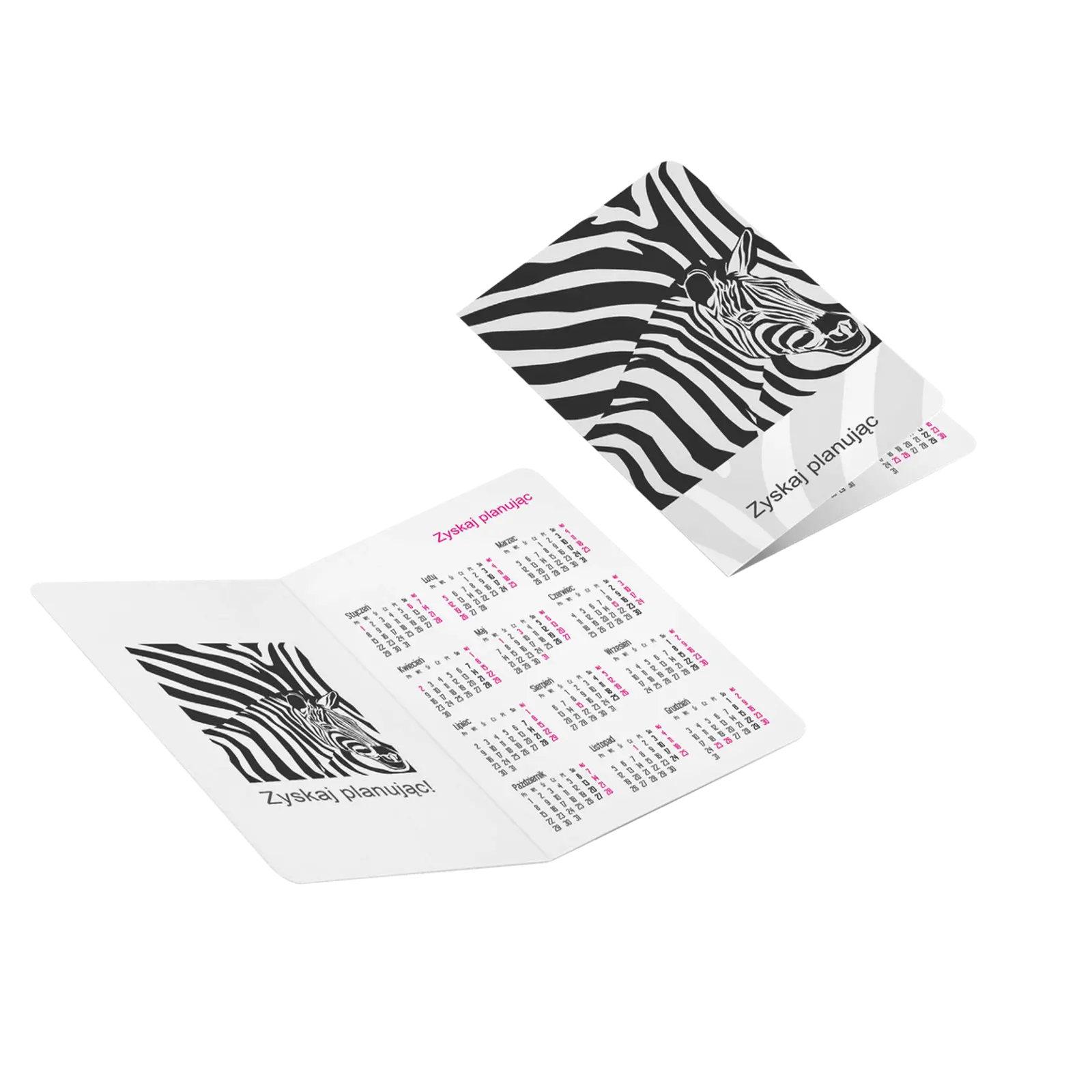 The entire calendar is made of 350 g coated paper with rounded corners. The open calendar measures 108 x 85 mm. When folded in half, it takes the 54 x 85 mm format. It does not take up much space and can always be kept on hand. It fits in a handbag, wallet or pocket. Despite its small size, there is plenty of space for your advertising design, both on the front and back of the folded calendar.