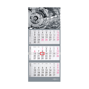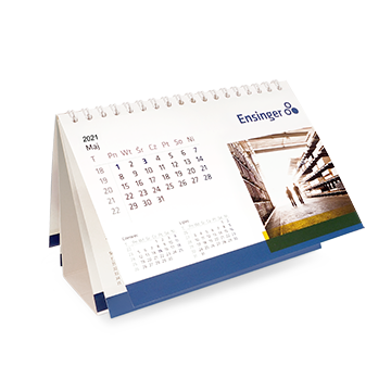 Kalendarz biurkowy typu piramidka o wymiarach135 x 160 mm zadrukowany jest projektem w tym samym stylu. Na jego podkładzie z kartonu 350 g znajdziesz te same elementy graficzne co na kalendarzu ściennym. Ze względu na zastosowanie innego formatu, ich układ jest jednak zmieniony. W tym modelu również klient poprosił o indywidualne kalendarium. Zostało ono nadrukowane na grubszym papierze offsetowym o gramaturze 170 g. Prawda, że mimo tych drobnych różnic oba kalendarz wyglądają niemal jak dwie połówki tego samego jabłka?